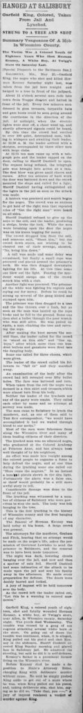 HomeArchiveHanged at Salisbury Hanged at Salisbury Date Published: May 26, 1898 Media Type: Newspaper Clipping About the Victim Name: Garfield King Date of Death: May 25, 1898 Place of Death: Maryland Images are scaled in fit in preview. Click on the image to see it in full.