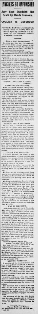 HomeArchiveLynchers Go Unpunished Lynchers Go Unpunished Date Published: Jul 14, 1896 Media Type: Newspaper Clipping About the Victim Name: Sidney Randolph Date of Death: Jul 04, 1896 Place of Death: Maryland Images are scaled in fit in preview. Click on the image to see it in full.