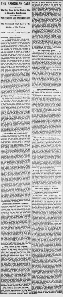HomeArchiveThe Randolph Case The Randolph Case Date Published: Jul 06, 1896 Media Type: Newspaper Clipping About the Victim Name: Sidney Randolph Date of Death: Jul 04, 1896 Place of Death: Maryland Images are scaled in fit in preview. Click on the image to see it in full.