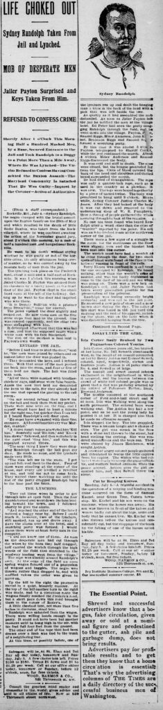 HomeArchiveLife Choked Out Life Choked Out Date Published: Jul 04, 1896 Media Type: Newspaper Clipping About the Victim Name: Sidney Randolph Date of Death: Jul 04, 1896 Place of Death: Maryland Images are scaled in fit in preview. Click on the image to see it in full.
